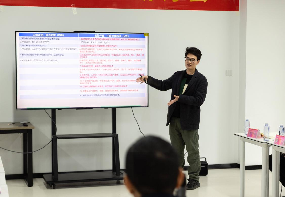 福建师范大学心理健康指导中心副主任丘文福结合丰富经验,从四级分类视角分享了心理危机干预工作方法。他围绕不同层级心理问题的识别标准、干预流程与应对策略展开详细讲解,为我校进一步完善心理危机干预体系、提升危机处置能力提供了宝贵借鉴。