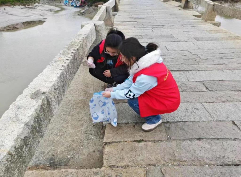 13名志愿者赴龙江古桥周边开展“护河爱水,清洁家园”活动,俯身清理石板缝隙顽固垃圾,捡拾草丛杂物,并对废弃物分类投放。