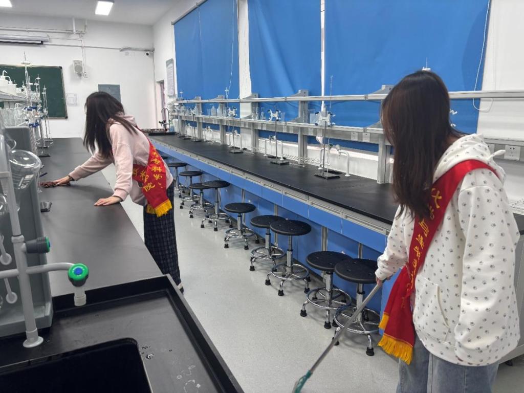 在校内实验室,志愿者按种类和有效期整理化学试剂与生物样品,张贴规范标签,擦拭实验台面清除污渍,清理水槽杂物及实验垃圾,让实验室焕然一新、井然有序。