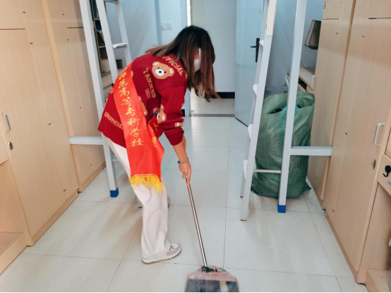 活动伊始,两委一会学生干部在宿舍楼下集合分配任务,以确保合理利用人力资源的同时提高工作效率。接着,志愿者们对每间宿舍进行清扫整顿,在整个过程中,大家没有一丝懈怠,无论是搬移物品、清洁地板还是擦拭座椅,从客厅到阳台都彻底清洁打扫,力求做到干净整洁。在志愿者们的协力配合下,宿舍卫生得到了极大改善,清扫、搬移工作顺利完成,使得宿舍面貌焕然一新。宿舍整顿不仅有利于宿舍文化的建设和发展,养成爱劳动、会劳动的习惯,也充分展现了同学们的良好精神风貌,让外出实习的学生拥有一个“舒适、温馨、安全、健康、和谐”的寝室环境。