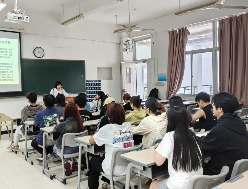 团课伊始,赖翠凤带领全体成员学习了《中国共产党纪律处分条例》的重点内容,通过逐句读、逐条学、逐点悟,加深对党纪党规的理解认识,增强纪律规矩意识。接着,她重点分析了当前学生干部队伍做事拖拉、官僚主义、形式化、功利化的工作作风问题,着重强调了学生骨干学纪、知纪、明纪、守纪的重要性。同时,与会人员就“学生干部作风建设问题”进行了交流研讨,从不同角度谈收获、体会,并思考总结如何在日常学习和工作中践行党的纪律要求,彰显青年学生干部的责任担当。最后,赖老师鼓励学生干部主动接受纪律教育,积极发挥先锋模范作用,做到坚持把纪律挺在前面、深学《条例》守底线、自觉淬炼强党性,争做新时代有为青年。