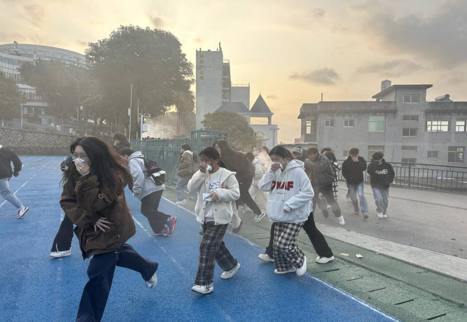 演练现场,消防员模拟了真实火灾发生时的紧急场景。随着警报声突然响起,宿舍楼内的学生们在老师的引导下,迅速用湿毛巾捂住口鼻,弯腰低姿,沿着预定的疏散路线有序跑下楼,紧急撤离到指定的安全区域。整个疏散过程快速且有序,充分体现了学校在日常消防安全教育中对应急疏散技能的有效传授。