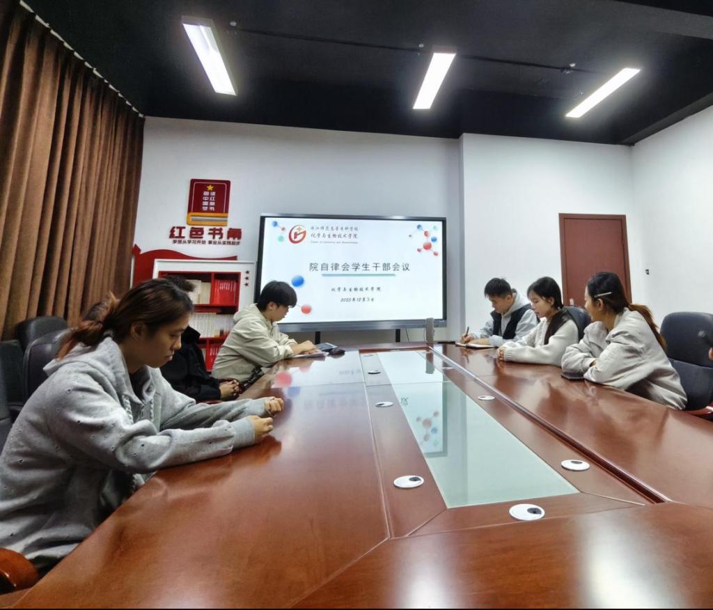 为进一步强化学生干部队伍建设,提升组织凝聚力与工作执行力,化学与生物技术学院于2025年12月3日在仓山校区党员活动室召开自律会学生干部工作会议。学院自律会指导老师龚俊浩及自律会全体学生干部参加,会议由自律会会长杨嘉茹主持。