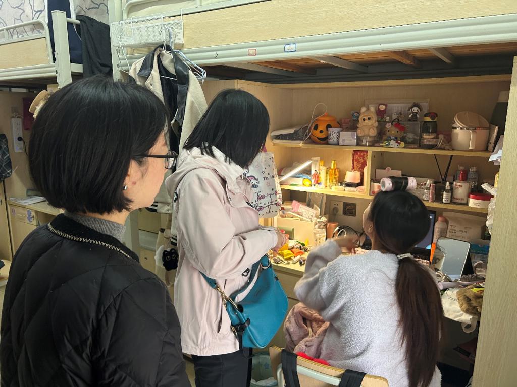 走访过程中,袁晓娟一行严格按照宿舍安全检查标准,对各楼栋宿舍的消防安全、用电安全、卫生状况等重点区域进行了细致排查。每到一间宿舍,老师们重点检查了违规使用大功率电器、私拉乱接电线等违规行为。同时,袁晓娟副院长与同学们亲切交流,详细询问大家的住宿情况和日常生活状态,叮嘱同学们要提高安全防范意识,自觉遵守宿舍管理规定,养成良好的生活习惯,共同维护整洁、安全的宿舍环境。