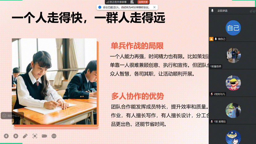 班会上,赖老师指出,团队协作与问题解决能力是现代职场中不可或缺的核心素养,更是毕业生顺利实现从校园到职场转变的关键支撑。接着,她系统讲解了团队协作的基本原则、角色分工与协作流程,帮助学生明确自身在团队中的定位与核心职责,掌握高效协作的实操方法。在问题解决能力培养方面,她拆解出逻辑闭环的问题解决步骤,从精准问题识别、深度剖析根源、到科学方案制定、动态实施评估,引导学生构建系统化、结构化的解题思维。此外,赖老师还围绕职场中的有效沟通这一协作关键展开指导,重点指导学生如何清晰表达观点、高校倾听意见、精准反馈意见以及灵活协调分歧,助力提升团队整体协作效率与凝聚力。