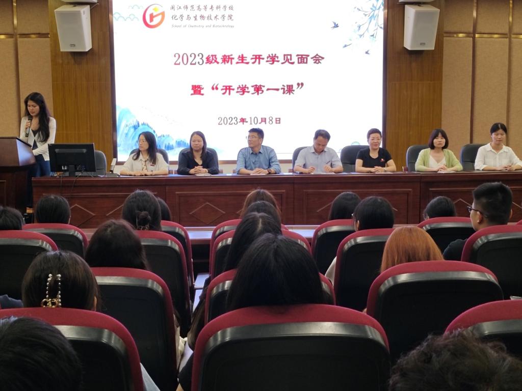 2023年10月8日,化学与生物技术学院在仓山校区多功能厅开展2023级新生开学见面会暨“开学第一课”活动。活动由新生辅导员孙雯晶主持,学院党总支书记王华、院长陈宗保、副书记张瑛、副院长林媛、团委书记赖翠凤、辅导员、班主任、23级新生助导以及仓山校区23级全体新生参加。
