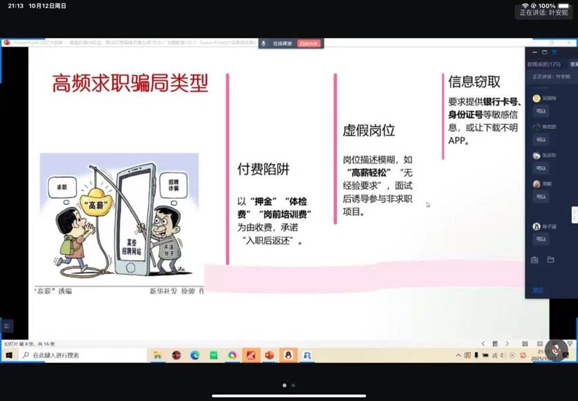 当前正值秋季招聘黄金期,各类招聘信息纷繁复杂,学生因求职经验不足容易陷入求职骗局,班会就此展开针对性指导。活动中,主讲人叶安妮老师重点介绍了付费入职、虚假岗位、信息窃取等三类常见求职陷阱。为有效防范风险,提醒同学们应牢记“三查两不一存”原则:查企业资质、查岗位真实性、查面试地点;不轻易缴费、不轻信非正规渠道信息;注意保存聊天记录、面试地点、企业承诺等证据,以便维权。