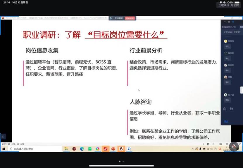 除风险防范外,班会还聚焦“精准求职”核心,引导同学们主动开展职业调研,建议同学们可从招聘平台、企业官网、行业报告等渠道,了解目标岗位的职责要求、薪资水平与发展前景。同时鼓励大家积极借助学长学姐、导师及行业从业者等人脉资源,获取真实可靠的一手信息,减少因“信息差”导致的求职偏差。在面试技巧指导环节,叶安妮老师着重强调用细节案例替代空话,如用“跨部门协作时,牵头同步进度,解决3次信息差,项目提前5天落地”展现能力,同时建议同学们借助简历、STAR法则、作品集展示等方式,全方位凸显自身优势。