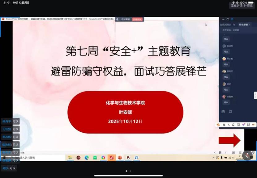 为切实增强学生求职防骗意识、系统提升面试能力,化学与生物技术学院于2025年10月12日晚组织开展“避雷防骗守权益,面试巧答展锋芒”主题班会。班会结合实用防骗技巧、职业调研方法与面试实操能力展示等核心内容,精准对接学生求职需求,助力同学们在求职路上行稳致远。