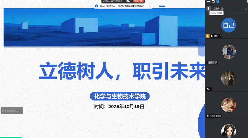 为引导毕业生树立正确的职业价值观,提升职业道德与职业素养,化学与生物技术学院于2025年10月19日晚以线上形式组织开展“立德树人,职引未来”主题教育班会。