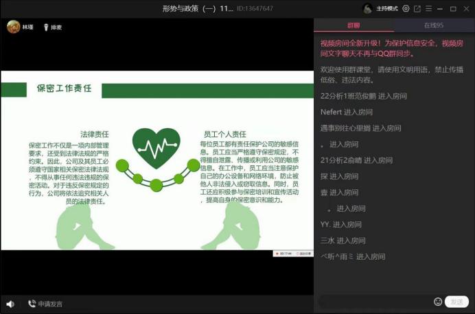 为加强学生保密宣传教育,增强毕业生就业保密的责任感,强化个人保密意识,2024年5月5日,化学与生物技术学院组织2024届毕业生线上开展了“就业保密,我们的共同责任”主题班会。