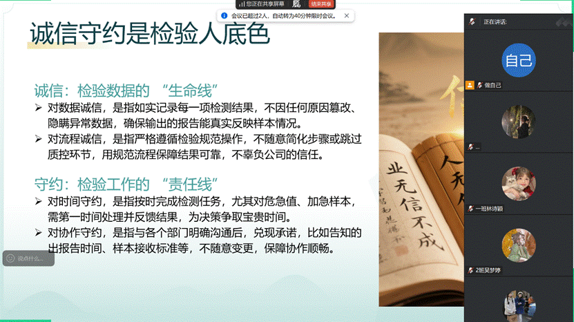 班会上,赖老师以当前就业市场人才素质需求为切入点,着重强调职业素养在个人职业发展中的基础性作用。她指出,职业素养是职场成功的关键基石,其内涵不仅包括专业技能,更涵盖职业道德、职业态度等多个唯独。随后,她详细分析了职业素养的基本构成,指导学生如何在日常学习中有意识地培养职业态度与礼仪规范。在职业道德培养环节,她重点阐述诚信守约、责任担当等核心要素,引导学生从校园生活点滴做起,夯实职业道德根基;在职业能力提升方面,她介绍了时间管理、有效沟通等关键能力的培养技巧,并给出具体实践建议。