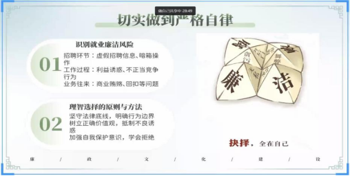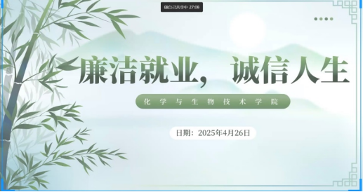 为引导青年学子树立正确职业观与价值观,扣好职业生涯的“第一粒扣子”,4月26日,化学与生物技术学院通过线上平台召开“廉洁就业,诚信人生”主题班会。
