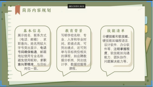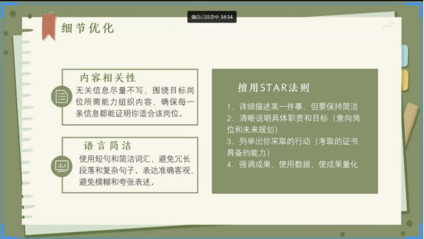 此次班会,为同学们提供了系统、全面的简历制作指导,为学生提供了切实可行的求职指导。同学们表示通过系统学习简历制作技巧,对职业规划有了更清晰的认识,后续将结合培训内容优化个人材料,为未来就业奠定坚实基础。