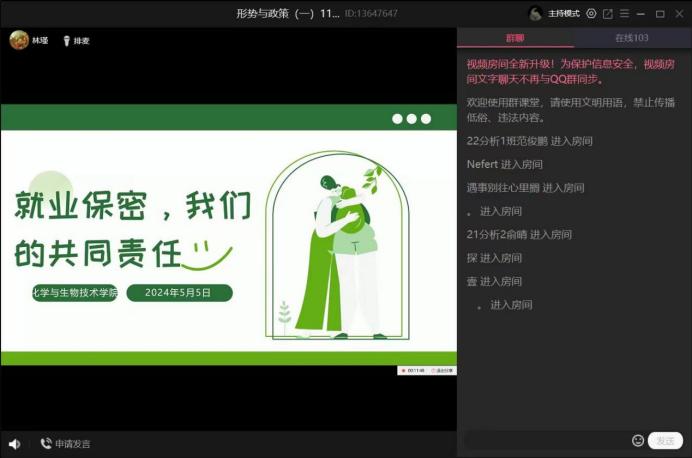 为加强学生保密宣传教育,增强毕业生就业保密的责任感,强化个人保密意识,2024年5月5日,化学与生物技术学院组织2024届毕业生线上开展了“就业保密,我们的共同责任”主题班会。
