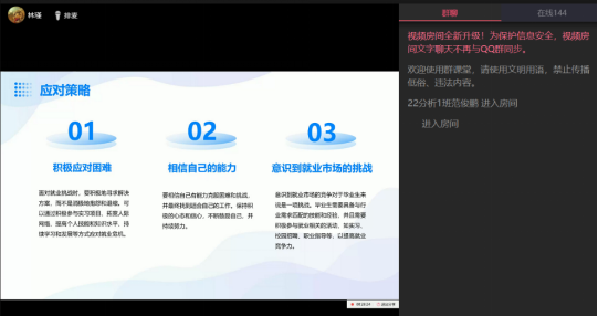 为全力推进我院2024届毕业生就业工作,帮助毕业生树立正确的就业观和择业观,化学与生物技术学院于2024年3月17日线上开展了毕业生就业指导讲座——“2024年应届生就业环境分析及如何提高就业竞争力”。会议由辅导员林瑾主持,2024届全体毕业生参加。