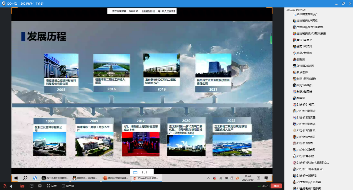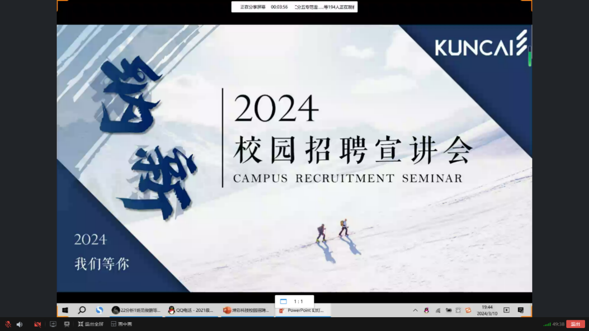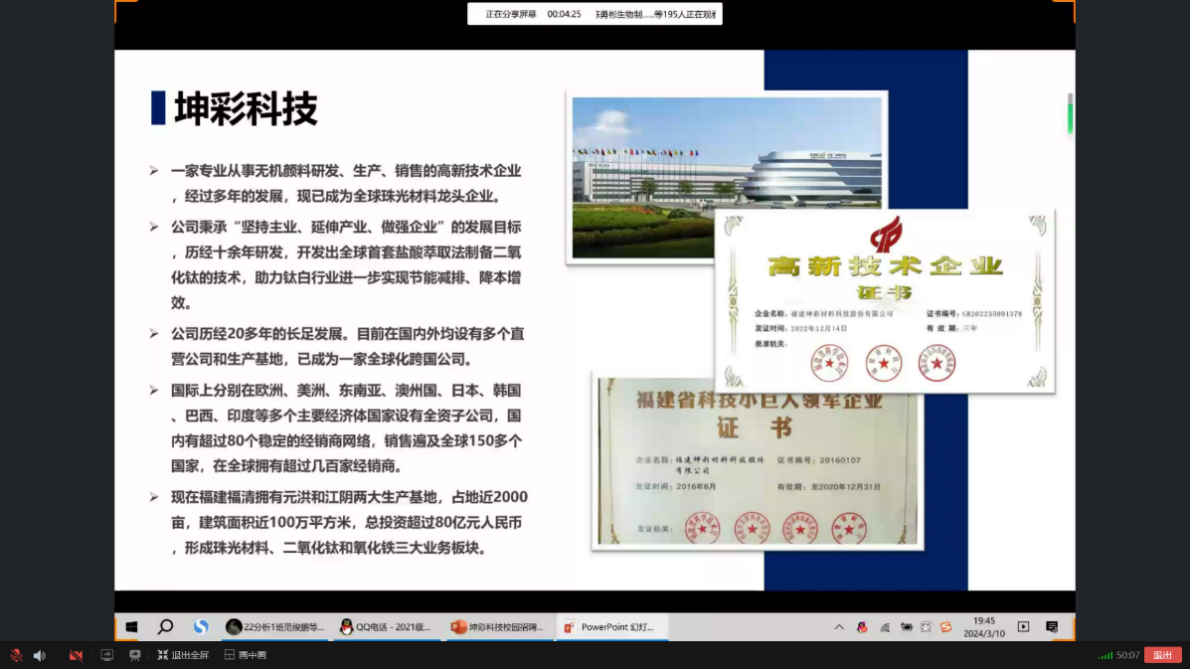 为进一步贯彻落实高校毕业生就业工作的决策部署,加强校企合作,拓宽毕业生就业渠道,促进我校毕业生更加强充分、高质量地就业。化学与生物技术学院联合福建坤彩材料科技股份有限公司于2024年3月10日开展了线上宣讲会。会议由学院党总支副书记张瑛主持,2024届全体毕业生参加。