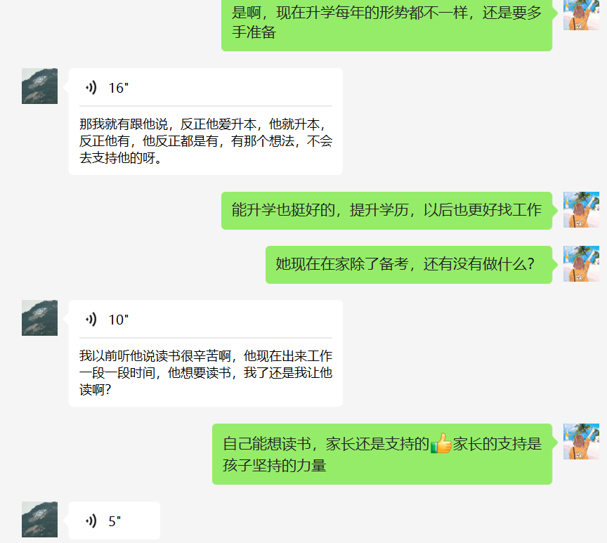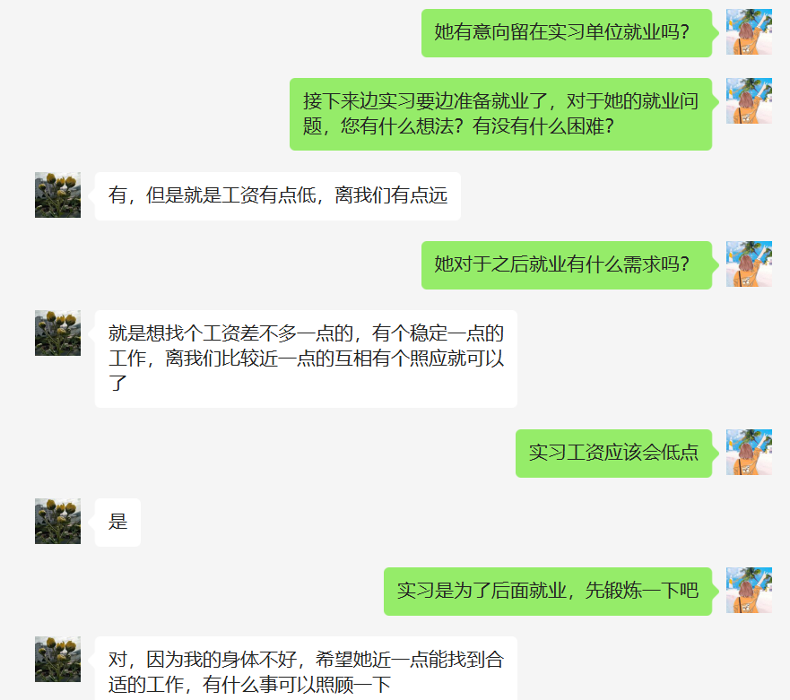 “暖心云谈”:学院采用“一对一连线”的方式,辅导员通过微信与毕业班学生家长进行“云端”面对面交流。辅导员向学生家长介绍学生的实习成长进步情况,围绕家长关心的孩子学业、毕业出路以及未来规划等帮忙出主意、想办法,解读国家和政府的就业政策,解答家长疑惑,帮助有就业需求的学生联系校企合作单位,为困难生家庭提供力所能及的帮助。