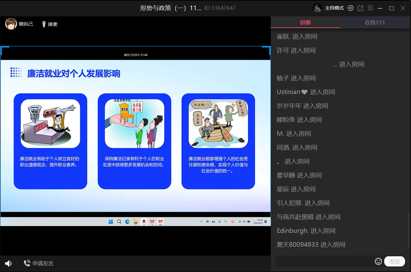 为加强毕业班学生敬廉崇洁的观念,引导毕业生廉洁修身、廉洁从业,系好走向社会的“第一粒扣子”,化学与生物技术学院于2024年6月2日在线上开展“崇廉尚洁,诚信守纪”主题班会。
