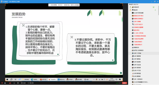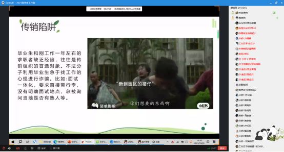 会上,赖老师通过招聘防骗、培训防骗、合同防骗、规避指南四个方面向同学们详细介绍了在求职道路中会遇到的各种各样的求职骗局及诈骗手段,比如付费实习、骗取个人信息、只试用不录用、协议陷阱等。针对近年来愈加严重的求职诈骗、校园诈骗等案件,她以电影《孤注一掷》为切入点,让同学们对于诈骗、传销的危害有了更深层次的认知,留心诈骗“陷阱”。除了要清楚地认知求职诈骗,还要懂得分辨和规避求职诈骗,赖老师提醒同学们求职时提前对企业进行考察,不要过于心急,要放平心态,同时要客观地看待自己的实力,求职的每个环节都要提高个人风险意识,强化自我保护,积极学习防范技能。