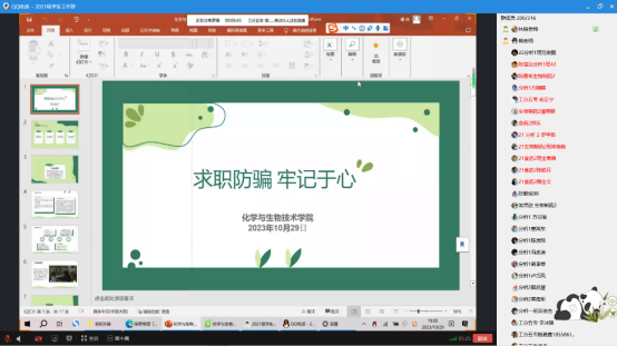 为增强学生防诈骗意识,提升学生识诈反诈能力,预防就业诈骗圈套,2023年10月29日,化学与生物技术学院线上开展了“求职防骗 牢记于心”主题班会,2021级全体学生参加。