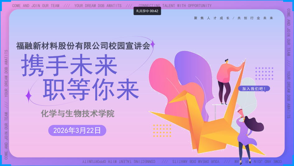 为进一步拓宽毕业生就业渠道,搭建校企交流与人才输送平台,助力学子高质量就业,化学与生物技术学院于2026年3月22日邀请福融新材料股份有限公司,举办专场招聘宣讲会。