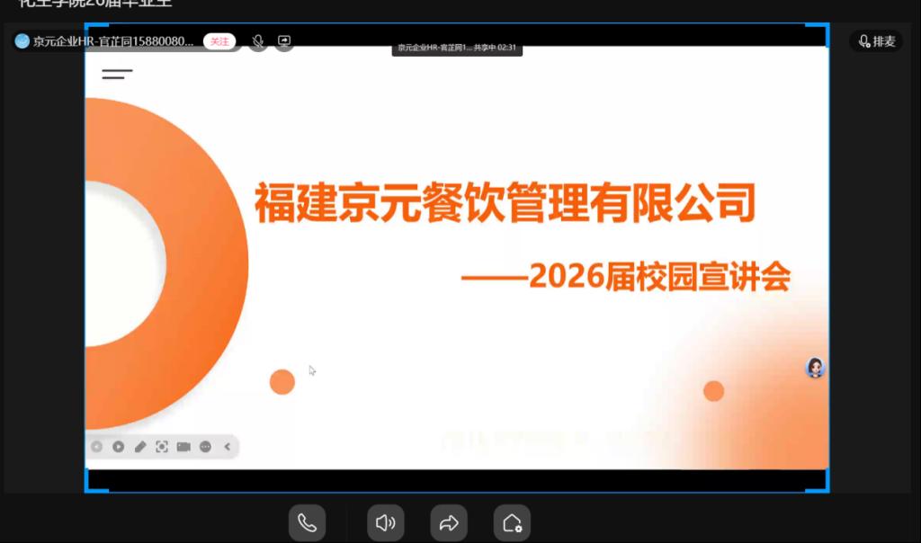 为精准对接企业用人需求,拓宽毕业生就业渠道,2026年4月12日晚,化学与生物技术学院特邀福建京元餐饮管理有限公司开展线上专场招聘宣讲会,全体毕业班学生参加。