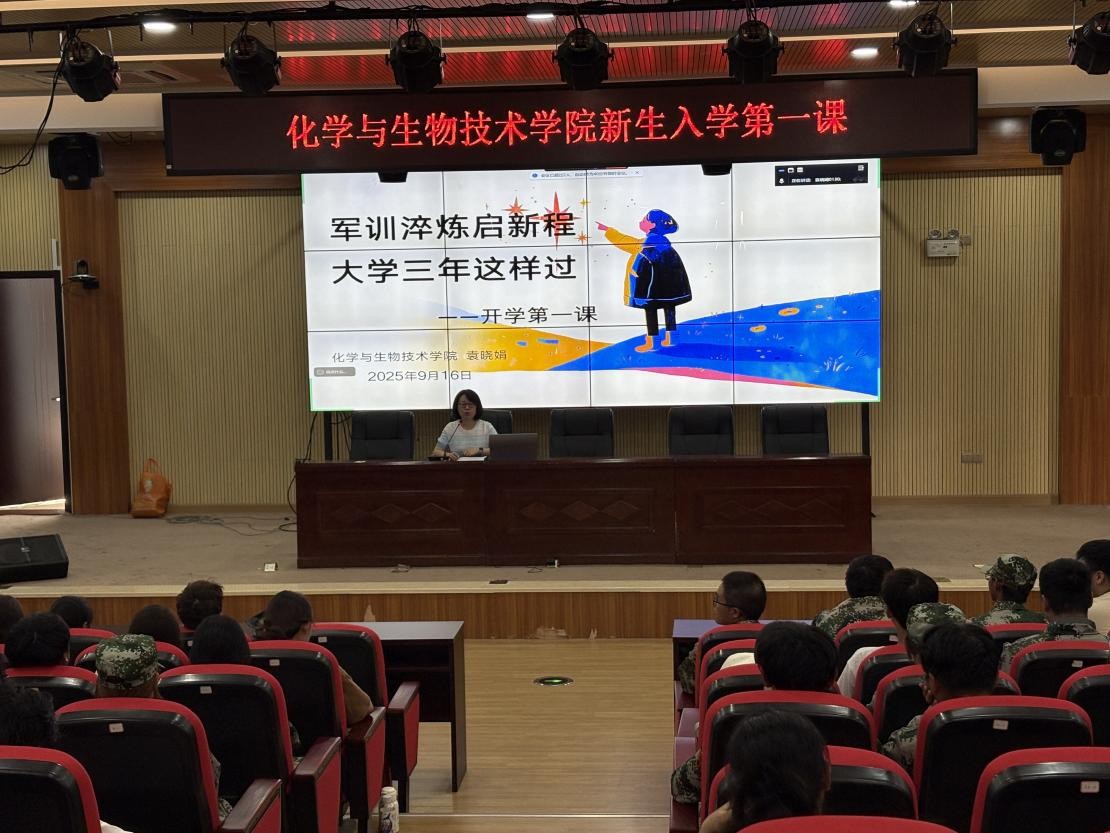 为强化2025级新生思想政治教育,助力新生扣好大学生活的“第一粒扣子”,帮助其迅速适应校园环境,激发学习热情,化学与生物技术学院于2025年9月17日上午以“军训淬炼启新程 大学三年这样过”为主题组织开展“开学第一课”系列教育活动。学院副院长袁晓娟担任主讲人,2025级福清校区全体新生参加。