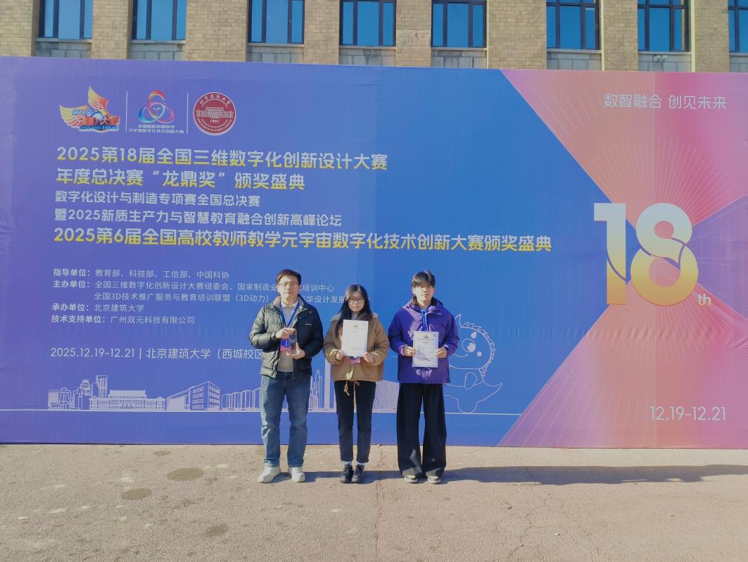 12月22日,由教育部、科技部、工业和信息化部、中国科协共同指导的第18届全国三维数字化创新设计大赛数字化设计与制造专项赛全国总决赛在北京建筑大学圆满落幕。我校智能制造学院陈攀、陈致州老师指导的刘菲琳、苏嘉坤两位学生凭借出色的表现先后在福建赛区和全国总决赛中荣获全省特等奖和全国三等奖。