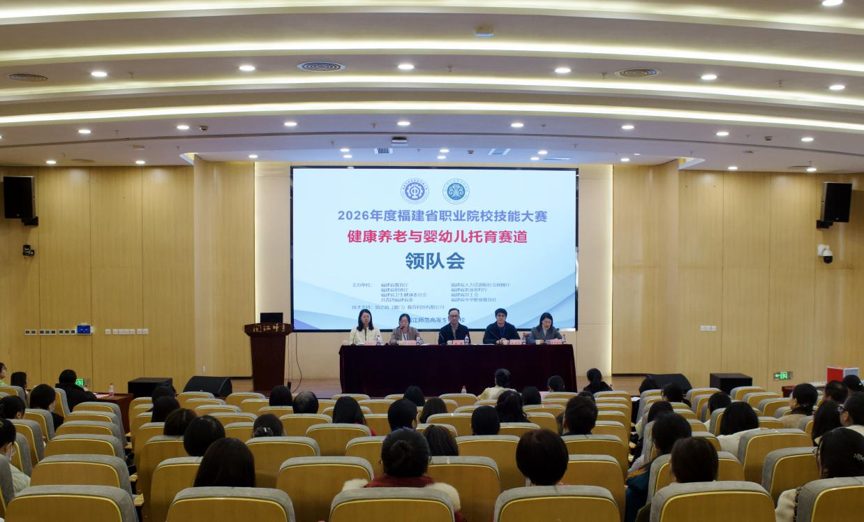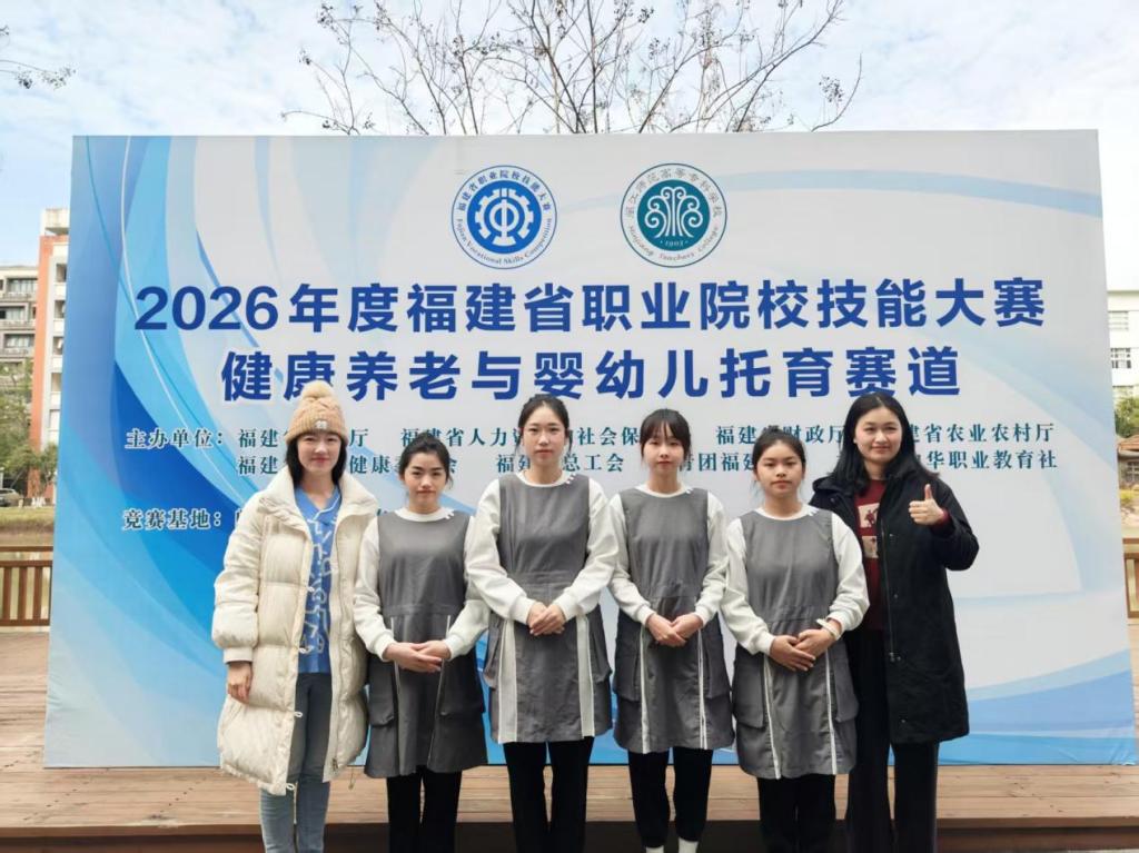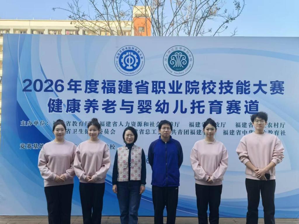 近日,2026年度福建省职业院校大赛健康养老与婴幼儿托育赛道在闽江师范高等专科学校旗山校区成功举办。本次赛事由福建省教育厅、福建省人力资源和社会保障厅等8家主办、闽江师范高等专科学校承办,吸引了全省50支参赛队伍、194名选手同台竞技。最终,我校学前教育学院王晶、林鹏两位老师指导的阮嘉怡、王旖旎、陈涵锐、林陈耿凯四位同学获得平行组第一,姚柳菁、柯芳芳两位老师指导的林雨楠、张晓桾、陈欣萍、林钰茹同学获得平行组第二的好成绩。