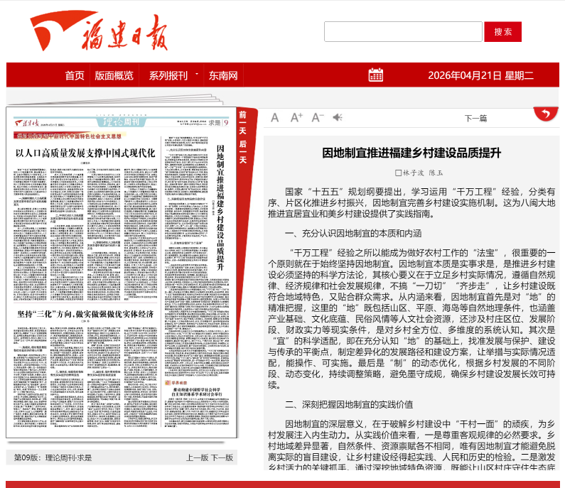 2026年4月21日,《福建日报》理论周刊求是版刊登我校党委书记林子波等署名文章《因地制宜推进福建乡村建设品质提升》,其原文内容如下: