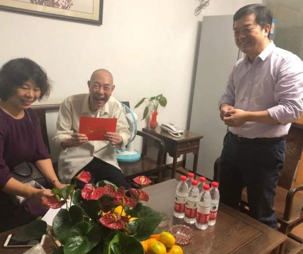 为把党和国家对劳动模范的关心关爱落到实处,营造共庆祖国华诞、共享伟大荣光和“学习劳模、崇尚劳模、关爱劳模、争当劳模”“尊重老人、关爱老人”的浓厚氛围,福州市劳模管理服务办公室开展重阳节期间走访慰问高龄劳模活动。10月16日下午,福州市教育局四级调研员肖祥艳、福州市教育工会副主席杨春雷、福州市教育工会干部翁沂、闽江师专工会常务副主席林锦芯一行前往五洲大厦,代表福州市劳模办、福州市教育局、福州市教育工会、闽江师专工会慰问我校高龄劳模吴德涵老师,给吴老送上慰问金和鲜花,并向他致以节日的问候。