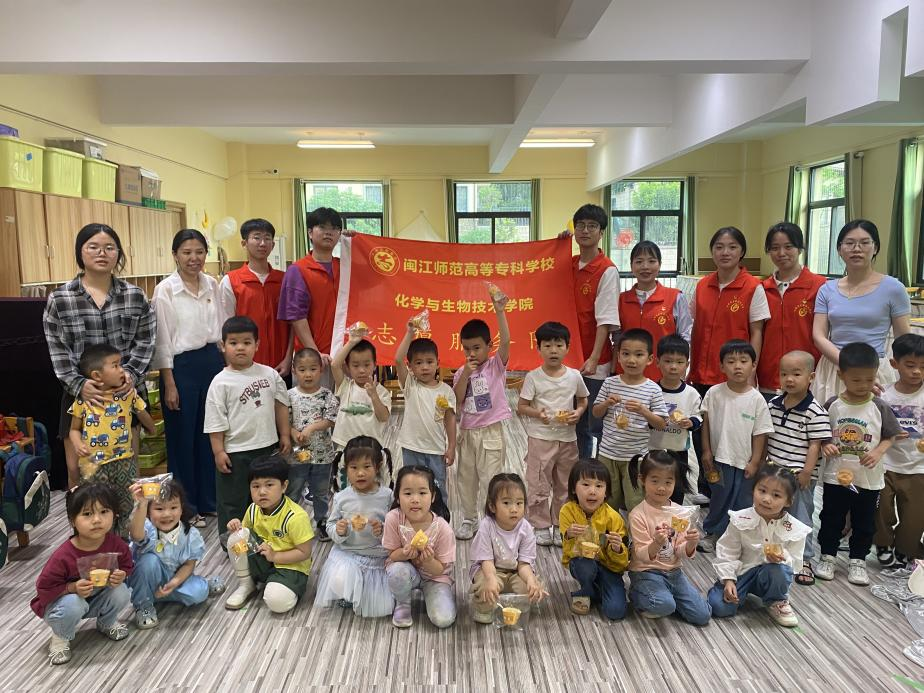 为了加强青少年、儿童对食物营养、食品安全的认识,引导化生学院学生积极开展专业知识的传播与应用,5月15日,化学与生物技术学院教师党支部副书记黄雅萍带领团员学生前往闽江师范高等专科学校附属实验幼儿园开展“党建引领志愿红,青年儿童共成长”食育浸润幼儿课堂志愿服务活动。