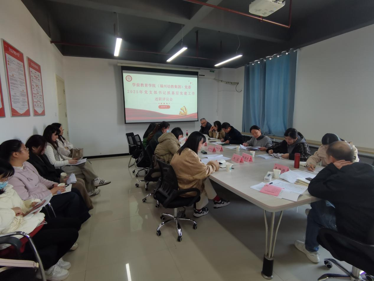 1月14日下午,学前教育学院(福州幼教集团)党委在旗山校区明德楼6楼党员活动室召开2025年度党支部书记抓基层党建工作述职评议会。学院党委班子成员、各党支部书记及党员代表参加会议。会议由郭剑恩同志主持。