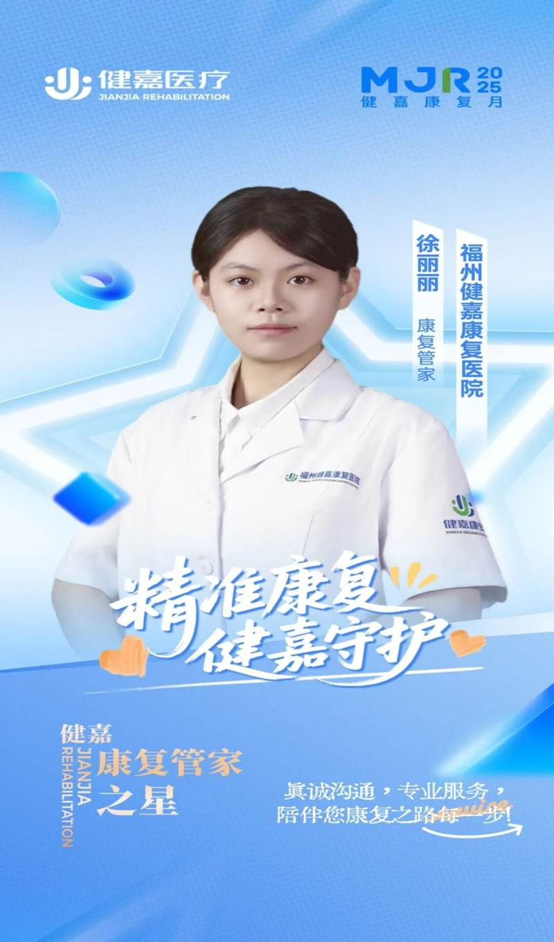 2024年7月,徐丽丽入职福州健嘉康复医院后凭借扎实的专业能力和贴心的服务态度,在2024年度全国健嘉康复医院评选中荣获健嘉医疗"优秀康复管家"称号。徐丽丽始终铭记母校的教导,在工作中她始终把患者需求放在首位,用专业和耐心赢得了"比家人更懂康复需求"的口碑。