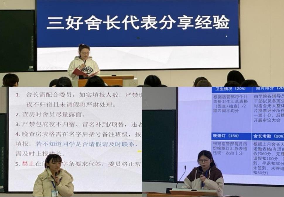 会上,宿管部通报宿舍安全检查情况,明确用电规范、卫生标准与安全管理红线;宿舍文化宣传部解读 “三好宿舍” 评选细则,鼓励各宿舍积极争创标杆。优秀舍长代表分享管理经验,为全体舍长提供实操借鉴。