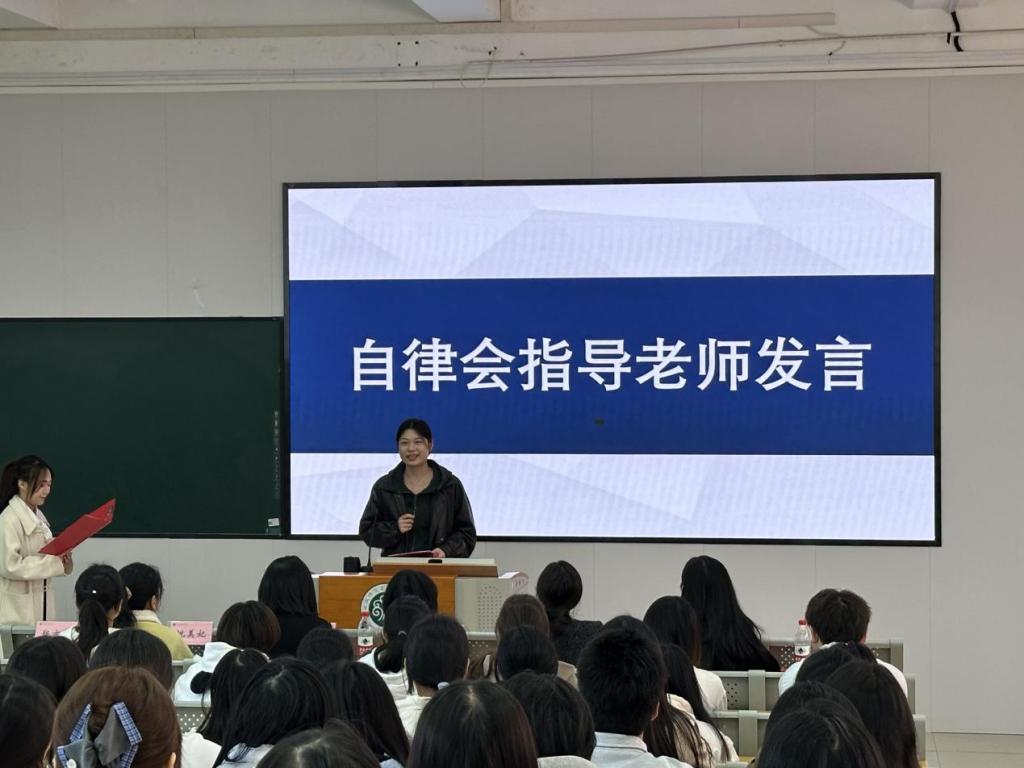 自律会指导老师郑亦琅通报本学期舍长考核情况,强调舍长要履行“领头人”职责,发挥桥梁纽带作用,及时传达要求、反馈诉求,助力宿舍文明建设。