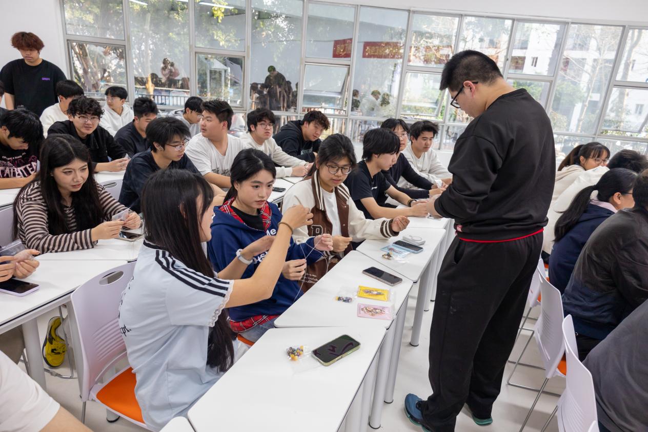 “趣味问答”环节紧扣少数民族知识文化主题,大家在趣味互动中探寻民族历史、积累文化知识。“藏式巴珠”手工体验环节让同学们围坐桌前,手持承载着深厚藏族文化意蕴的珠子,亲手穿引编织,或专注复刻传统样式,或大胆融入创意设计。一针一线、一穿一引间,精美的巴珠作品缓缓成型。