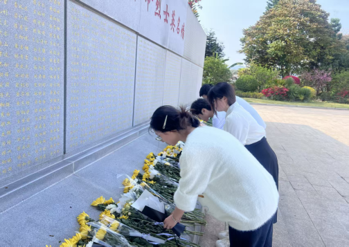在庄严的氛围中,志愿者代表缓步上前,向革命烈士敬献菊花。白菊与黄菊簇拥在纪念碑基座前,寄托着新时代青年学子对先烈的无限追思与敬仰之情。全体人员肃立致敬,深切缅怀革命先烈为国家独立、民族解放、人民幸福所建立的不朽功勋,追思他们不怕牺牲、无私奉献、忠诚担当的崇高精神。