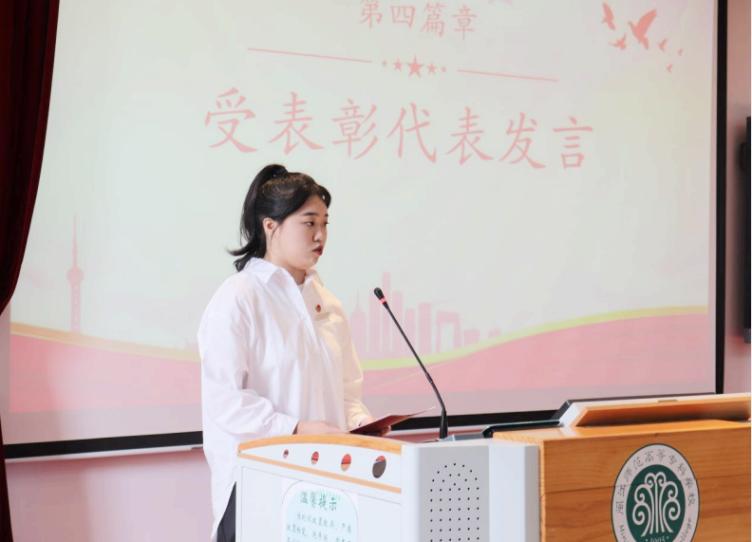 大会在嘹亮的国歌声中拉开序幕。杨美玲宣读了《关于表彰2021年度共青团工作先进集体和先进个人的决定》。获得“五四红旗团支部”、校“优秀共青团员”、校“第二课堂学习标兵”、“社团积极分子”、“明星志愿者”以及“优秀志愿者”等荣誉称号的获奖代表依次上台领奖。颁奖结束后,刘亦舒同学作为受表彰的个人代表进行发言,她分享了自己的学习经历和工作经验,展示了青年学子立志勤学、实干担当的青春风采,表达了要用实际行动践行“强国有我,做新时代有为青年”的信心和决心。