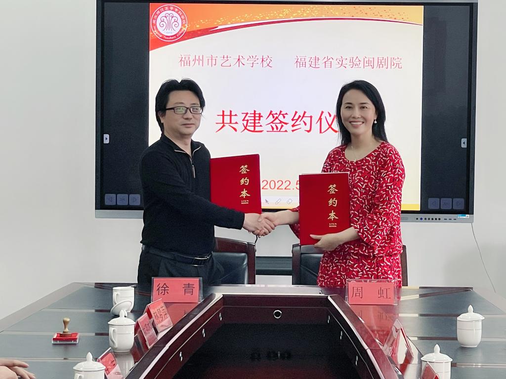 为进一步加强院校合作,深化产教融合,助推学生专业技能与院团岗位需求“无缝”衔接,5月11日上午,福州市艺术学校与福建省实验闽剧院在学校行政楼四楼会议室举行院校共建签约仪式。闽江师范高等专科学校艺术学院党委书记江柳青,院长、福州市艺术学校校长徐青,党委副书记林萍,副院长陈洪翔、福建省实验闽剧院院长周虹,党总支书记、副院长林大立,副院长林杰出席签约仪式,艺术学院闽剧教研室负责人及福建省实验闽剧院相关负责人员陪同。