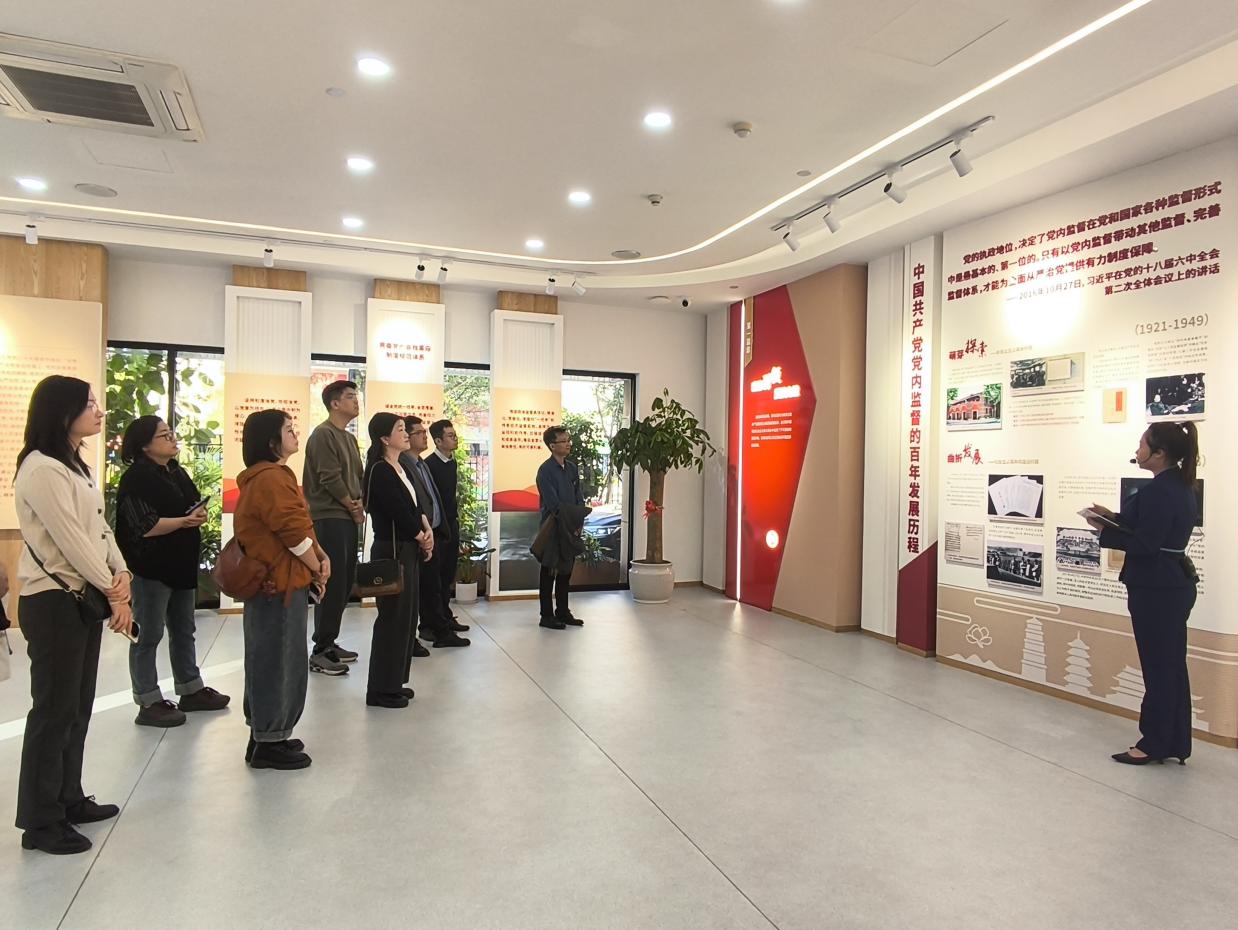 在讲解员的引导下,全体人员依次参观了“政治引领、强化监督、清风徐来、党员之家”四个主题展区。展览紧紧围绕“历史深度、理论高度、实践力度”的逻辑主线,深入解读了习近平总书记关于党的自我革命的重要思想以及新时代党的创新理论,系统回顾了党内监督的百年发展历程,生动阐释了党中央关于完善纪检监察专责监督体系的部署要求。通过参观学习,全体党员干部深刻认识到,坚持党中央集中统一领导是根本保证,是将监督制度优势转化为治理效能的关键所在,也是对贯彻落实党的二十届四中全会精神的具体实践。随后,在支部书记葛思华的带领下,全体党员面向党旗,重温入党誓词,再次铭记初心使命,坚定理想信念。
