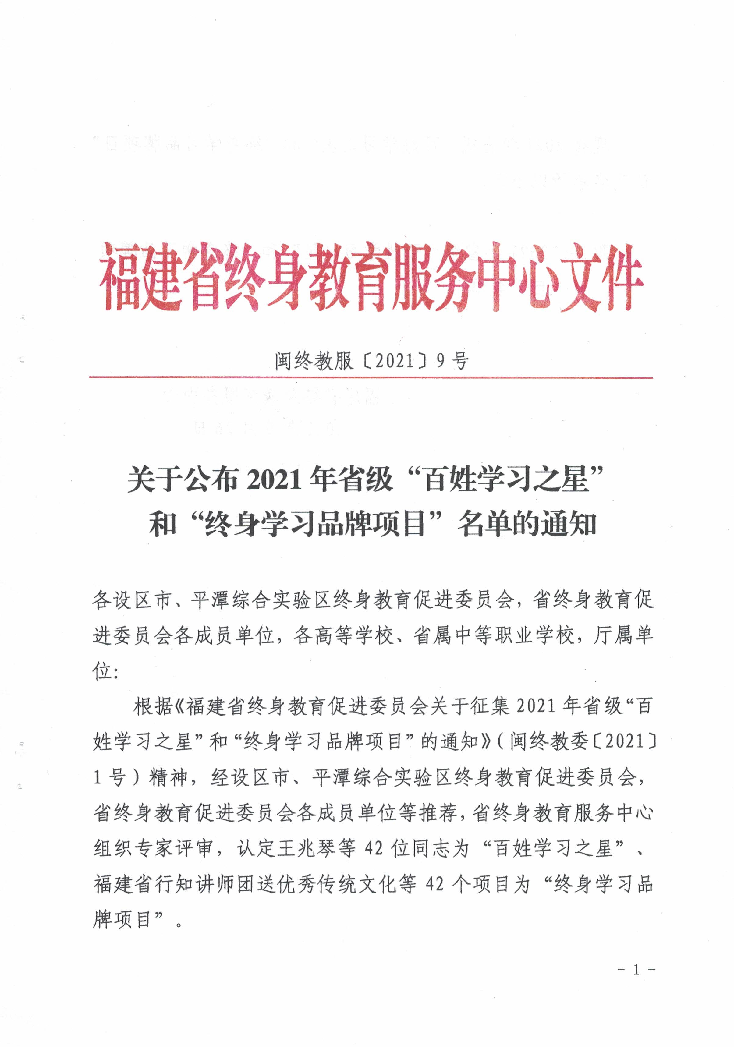 近日,根据文件《关于公布2021年省级“百姓学习之星”和“终身学习品牌项目”名单的通知》闽终教服〔2021〕9号,我校推出的“康养行动”项目被认定为2021年省级“终身学习品牌项目”。