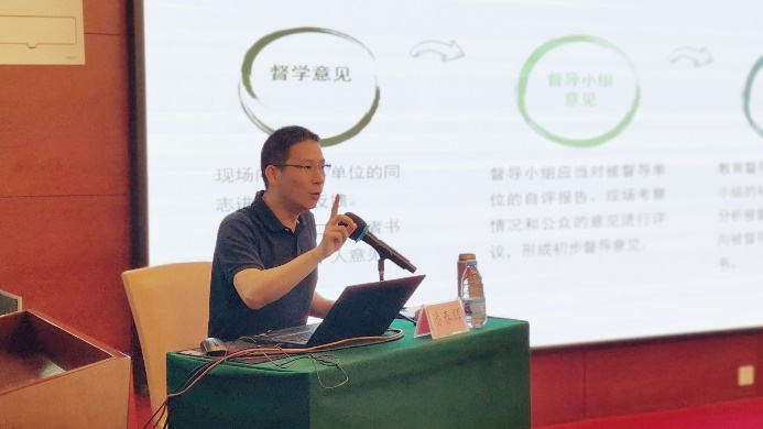 怀着满腔的热忱,全体督学在专家的引领下,开启了第四天的求知问道之旅。2022年8月4日上午,厦门市海沧区人民教育督导室的潘春晖主任为全体督学作了《教育督导意见与报告的再认识》专题讲座,介绍了公文的种类、功能、框架结构、撰写原则、文风表述及基本要求,详细讲解了“意见”与“报告”两种文体的撰写方法,分析了上行文与下行文的区别,让督学们感受到行文的严谨与规范,对督导的行文有了更高的认识,体会到“督导有规,行文有则”。潘春晖从案例描述、案例分析、案例反思三个方面对督导案例进行专业详细的解读,他深入浅出的解说和鲜活生动的案例,把行动方案诠释到位,对如何开展有效督学指明方向,给在座督学以深刻启迪。