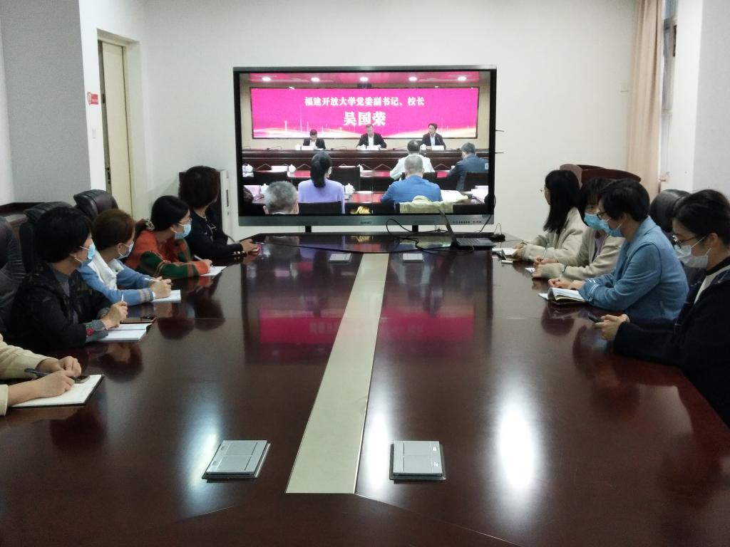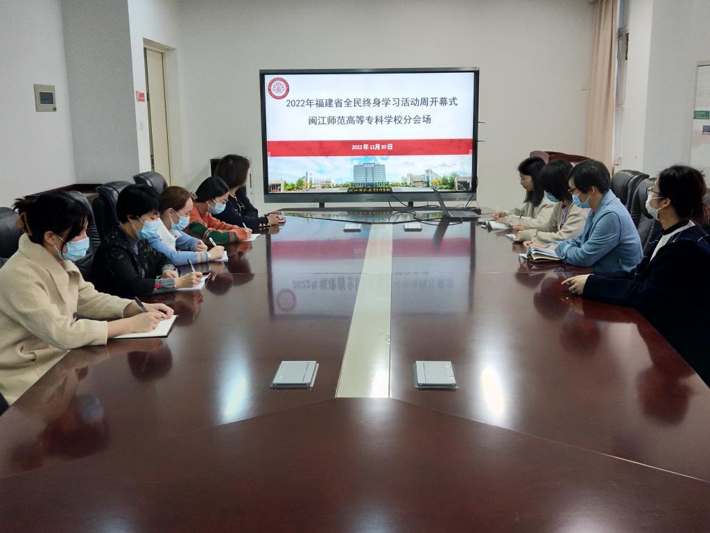 2022年11月30日,以“学习贯彻党的二十大,终身学习向未来”为主题的2022年福建省全民终身学习活动周正式启动。活动开幕式采用线上直播“主会场+分会场”方式进行,闽江师范高等专科学校设立分会场,继续教育学院院长兰浈,校工会常务副主席、市老年大学闽江师专分校副校长林锦芯及相关人员集中观看开幕式直播活动。