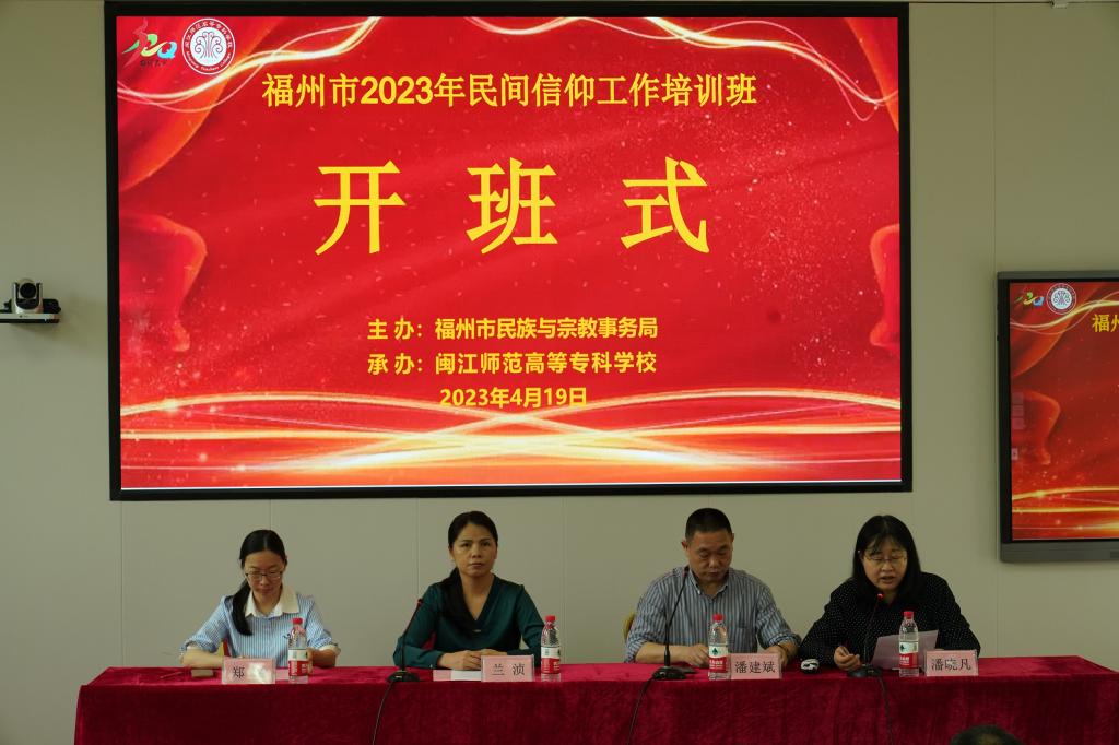 为进一步推进福州市民间信仰活动场所联系点管理规范化水平,积极发挥民间信仰促进社会和谐的作用,受福州市民族与宗教事务局委托,闽江师范高等专科学校于4月19日至21日在旗山校区举办“福州市2023年民间信仰工作培训班”。4月19日上午,培训班举行了开班式,出席的有闽江师范高等专科学校继续教育学院院长兰浈、福州市民族与宗教事务局民间信仰处处长潘建斌以及45名来自福州各县(市)区民间信仰工作干部、民间信仰联系点管委会人员。开班式由福州市民族与宗教事务局民间信仰处副处长潘晓凡主持。