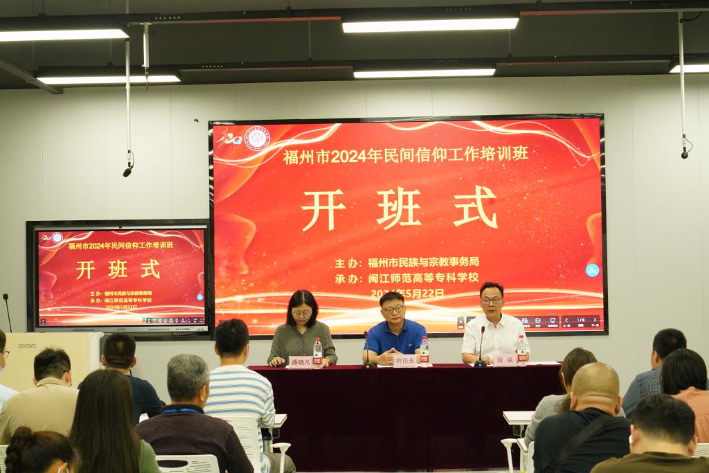 为深入贯彻落实习近平总书记对民间信仰工作指示精神,全面落实全国宗教工作会议和中央、省关于做好民间信仰工作的有关要求,进一步提高我市民间信仰工作人员的政治素质和管理水平,受福州市民族与宗教事务局委托,闽江师范高等专科学校于5月22日至24日在旗山校区举办“福州市2024年民间信仰工作培训班”。22日上午,培训班举行了开班式,出席的人员有福州市民族与宗教事务局党组成员、四级调研员钟民东,闽江师范高等专科学校副校长陈强以及45名来自福州各县(市)区民间信仰工作干部、民间信仰联系点管委会人员。开班式由福州市民族与宗教事务局民间信仰处副处长潘晓凡主持。