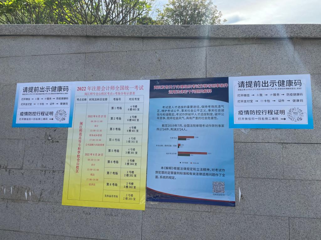 我校(仓山校区)于2022年8月27日-28日承接了“2022年注册会计师全国统一考试”。为了确保考试顺利进行,考前考务人员根据考务手册的要求对考场环境进行布置(设置了路标、路牌、警戒线等)、考试所需材料准备。