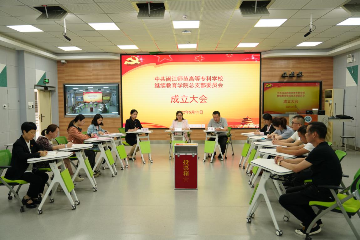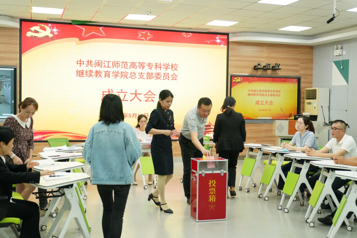 奏唱国歌之后,方斌同志代表继续教育学院党总支筹备工作小组作筹备工作报告,组织部部长马梅铃宣读了《中共闽江师范高等专科学校委员会关于成立中共闽江师范高等专科学校继续教育学院总支部委员会的通知》。党总支成立大会根据《中国共产党章程》和《中国共产党基层组织选举工作条例》的规定严格按照程序进行,审议通过了总支部委员会选举办法,产生了监票人、计票人名单。采取无记名投票和差额选举办法,选举方斌、兰浈、李姗、林丽珠、周靖华(按姓氏笔画排序)等5位同志为第一届继续教育学院党总支委员会委员。随后召开的第一届继续教育学院党总支委员会第一次会议,选举方斌同志为党总支书记,兰浈同志为党总支副书记,并研究确定了委员分工。