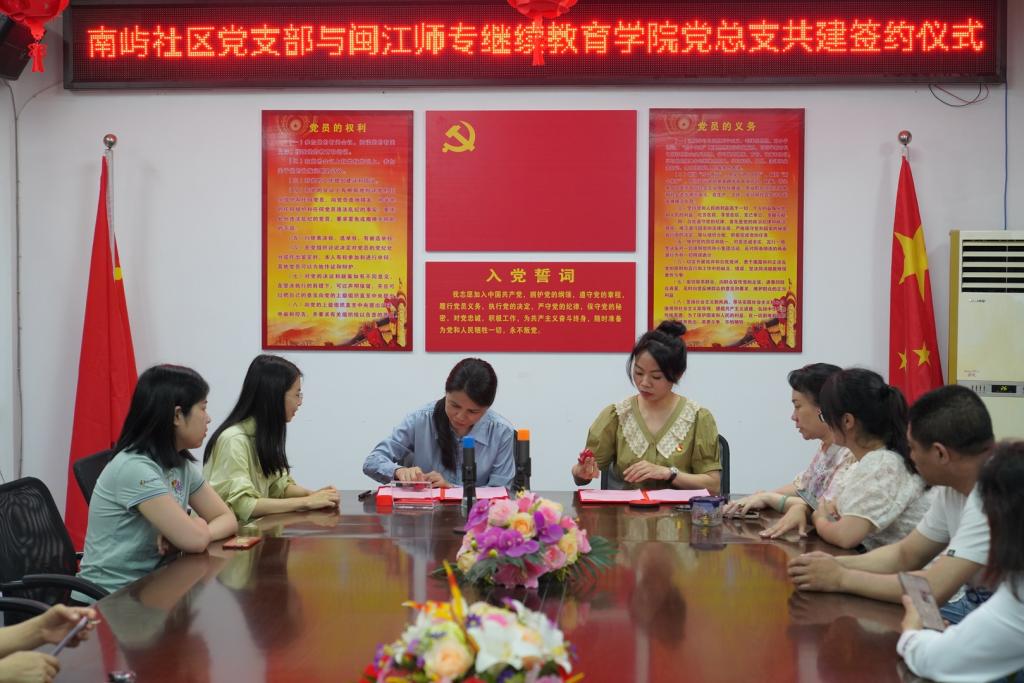继续教育学院党总支副书记兰浈、南屿社区党支部书记陈洁代表双方签订了协议。双方将按照“优势互补、共联共建、共谋发展”的原则,充分发挥各自优势,推动组织联建、活动互联、资源共享、经验共鉴,为双方推进党建创新,推动业务发展,合作共赢注入新的活力。